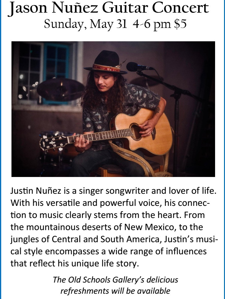 Location Old School Gallery 4009 Ice Caves Rd, Ramah, NM 87321 Category Live Event Date May 31 2026 Time 4:00 pm - 6:00 pm Cost $5.00 Labels Onetime Event Jason Nuñez Guitar Concert Jason Nuñez Guitar Concert Sunday, May 31 4-6 pm $5 Share this event + Add to Google Calendar + iCal / Outlook export 00 days 00 hours 00 minutes 00 seconds